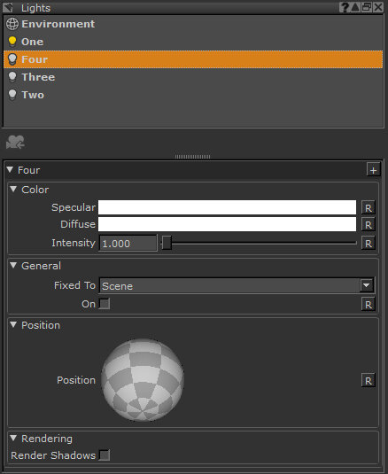 The Lights palette displays details of four basic lights, which you can enable or disable, and customize by adjusting their Color and Fixed To information, and an environment light, which you can adjust to add environment lighting from an image. For details, see the Customizing the View.