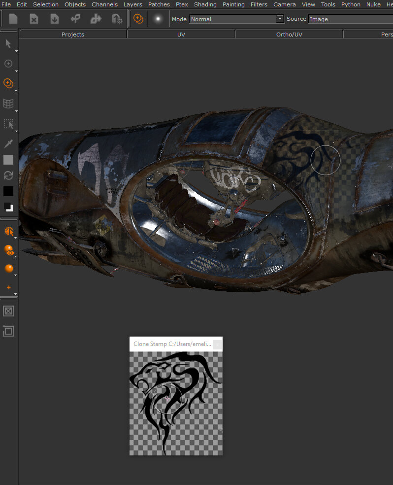 ) lets you position an image alongside an object, with a source point on the image relative to where the brush is on the object. Then as you paint, the source point on the image moves in sync with the brush on the object, and Mari copies from the image onto the corresponding spot under the brush on the object.