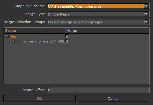 Each of the objects or entities, shown in the Object Hierarchy Tree, has a checkbox next to it for selecting which objects are merged. The Merge Type in the New Project dialog's Mesh Options determines how the objects are handled on merge: as a Single Mesh or Just Merge Nodes. Toggling the Merge checkbox of a parent object ticks the checkboxes of all the child objects as well, and signals that the parent and child objects should be merged into one GeoEntity, or object in Mari. You can also select a root object and toggle the Merge checkbox to determine if any other objects are merged into the root. When a camera appears in the Object Hierarchy Tree, the camera is shown with the Merge checkbox ticked by default. Cameras are not stored in a hierarchy in Mari, thus the state of the checkbox cannot be changed.