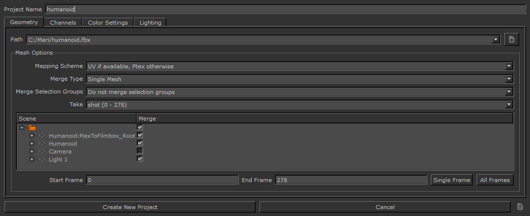 If you want to merge any of the objects (Entities or GeoEntities) on project creation, the merge type controls how Mari handles the merge operation. When merging as a Single Mesh, all the various geometries are merged into one geometry inside of a GeoEntity, and any object data for the merged objects is lost. When merging as Just Merge Nodes, all the merged objects are merged into one geometry inside a GeoEntity, but they keep their metadata and object data. |