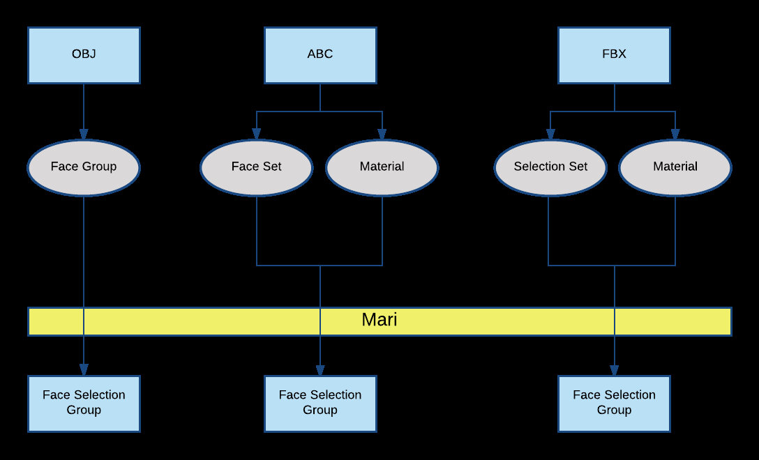 Unlike .obj files, selection groups are not created from faces on import. Instead, when loading an .abc file, Mari searches for whether it contains face sets exported from your modeling package. If it detects that there are face sets present, these are loaded on project creation or object import, as Mari's selection groups and added to the Selection Groups palette. Once you've created a project, you can create your own selection groups, if you wish.
