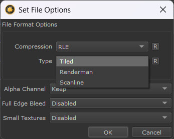 EXR files will be saved in the Renderman compliant format. The tile size is 32x32 and mipmaps will be generated.