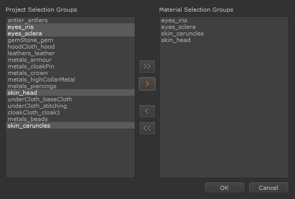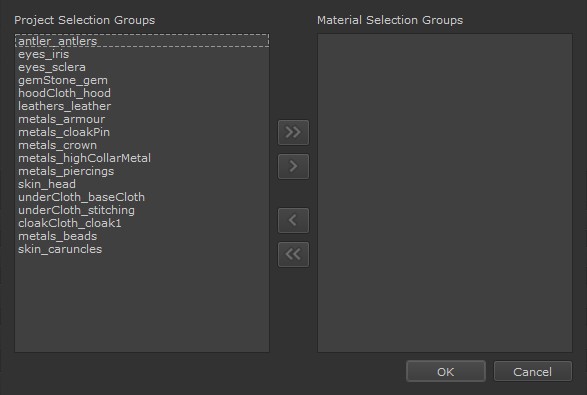 . All selection groups present in the Material Selection Groups column can be moved back into the Project Selection Groups column by clicking the left-pointing double arrow button