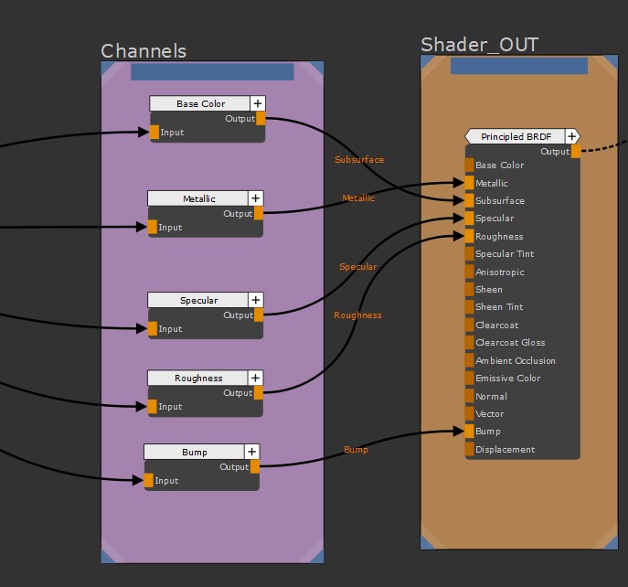 An example of a traditional Channels based workflow where all node streams are piped into Channels before being plugged into a single shader at the end of the node stream. |