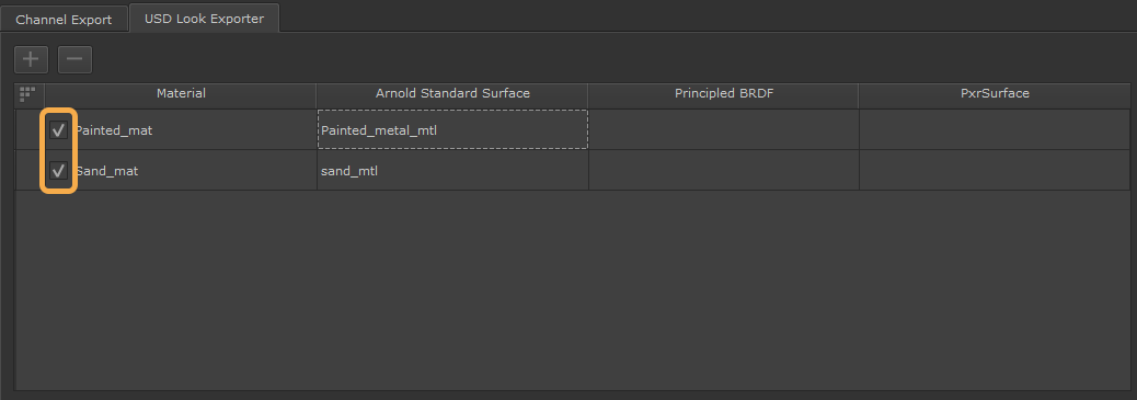 Tip: You can double click the box under Material to change the name of the materials you have added in the USD Look Exporter for better organization and file management purposes.
