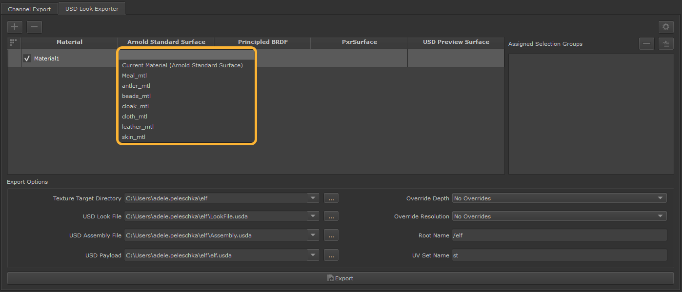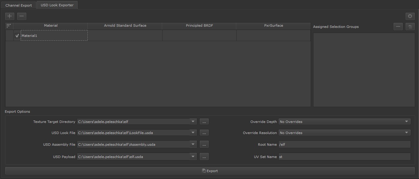 Once your materials are present in the USD Look Exporter, you can assign your materials to Selection Groups. If a selection group is assigned to a material, the assignments are stored in your LookFile, allowing you to bypass the usual setup required when beginning the LookDev process in another DCC.