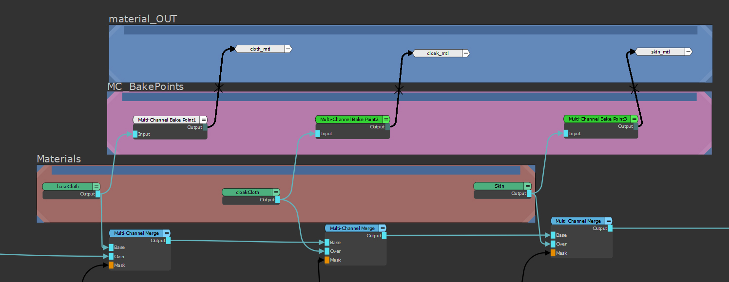 An example of a materials based workflow with Multi-Channel Bake Points and Shader nodes inserted after the material |