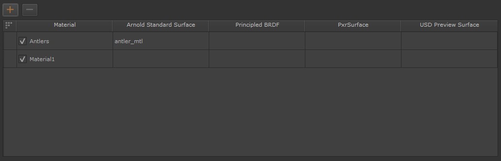 Multiple materials can be added to the USD Look Exporter, allowing you to export multiple materials into a single look file or assembly. To add additional materials: