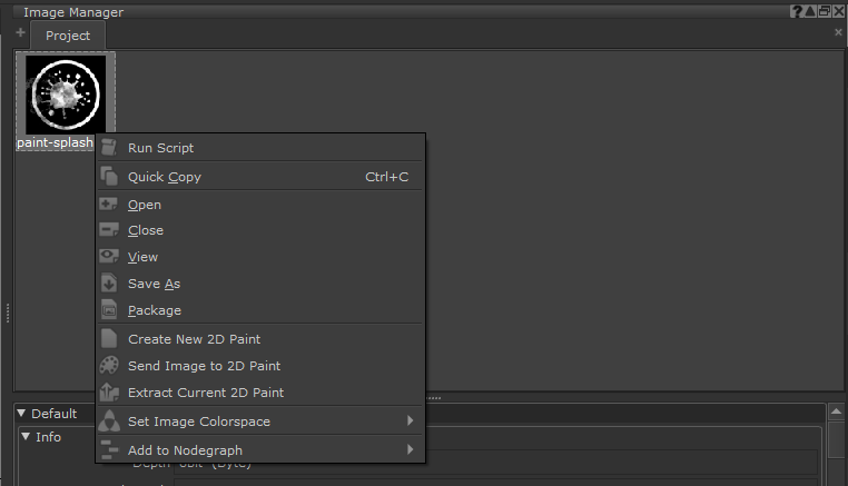 Note: Adding 2D images will also add them to the 2D tab on the Objects Palette. You can import and export the node graph as a .mrimg file from there, by using the right-click options Export 2D Paint and Import 2D Paint, which will allow you to save the 2D node tree / layer stack to disk separate to the main Mari cache.