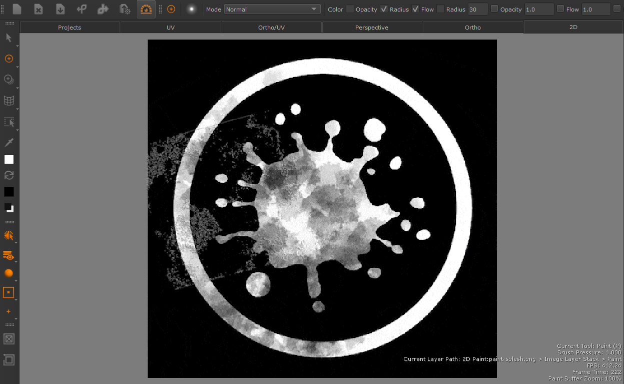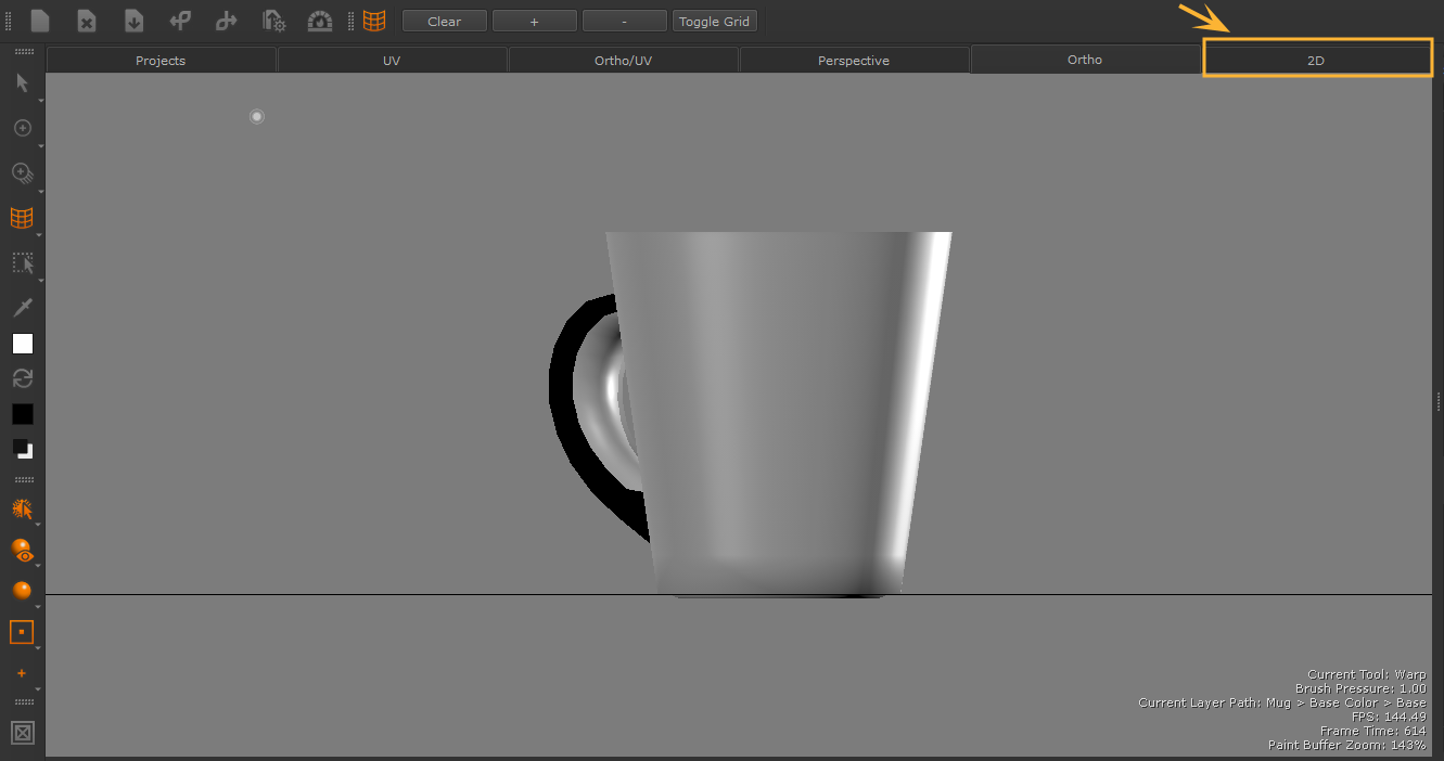 Opening the 2D pane will open an empty image ready for you to paint. Or if you already have an image opened in the 2D mode, you can re-open 2D mode easily by clicking on the 2D pane, next to the Ortho pane.