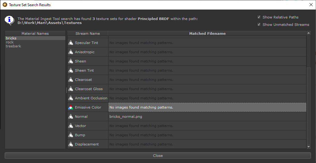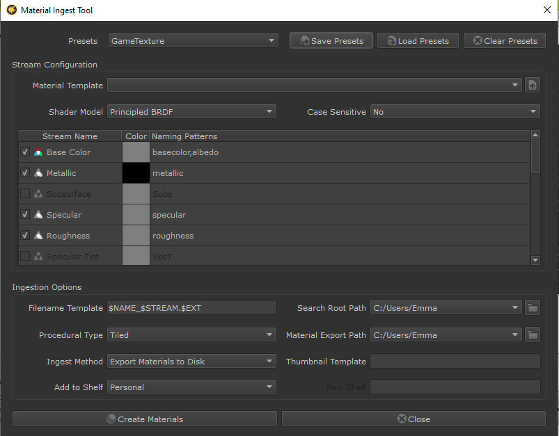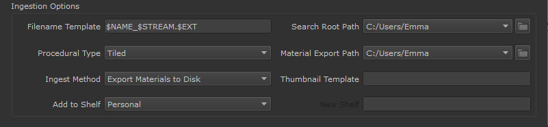 Note: The Material Ingest Tool dialog remembers the last settings used.