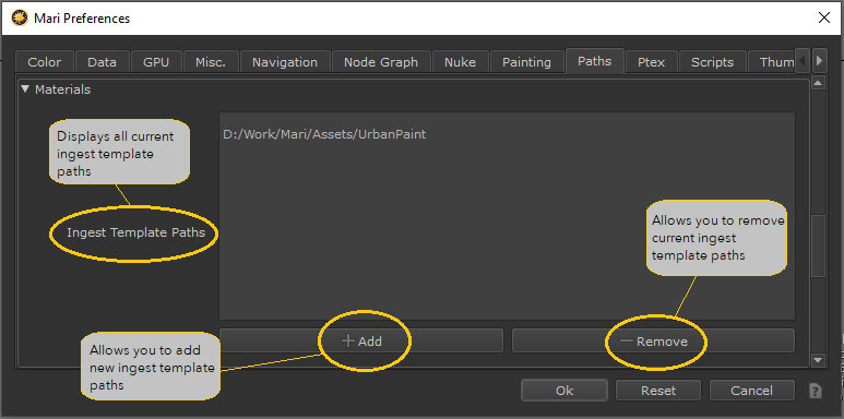 Note: Any paths defined in the Ingest Template Paths can be overridden by the following environment variable: MARI_MATERIAL_INGEST_TEMPLATES_SEARCHPATHS.
