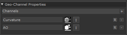 You can add Geo-Channels to your objects to define arbitrarily named geometry specific data such as ambient occlusion, and curvature in your material creation workflow. Since geo-channels are geometry-agnostic, you can use the same material across a variety of objects while ensuring the material looks realistic for the specific object. Geo-Channels must be added to your object in order for Geo-Channel nodes and layers to function. See Geo-Channel Node for more information.
