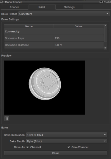 The Bake tab inside the Modo Render palette, with the Curvature Bake Preset selected.
