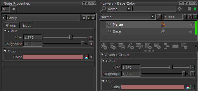 Exposed properties are displayed in the Group's Node Properties palette and in the associated Graph layer in the Layers palette. For example, given a merged Group in the Node Graph containing a Cloud and a Color node: