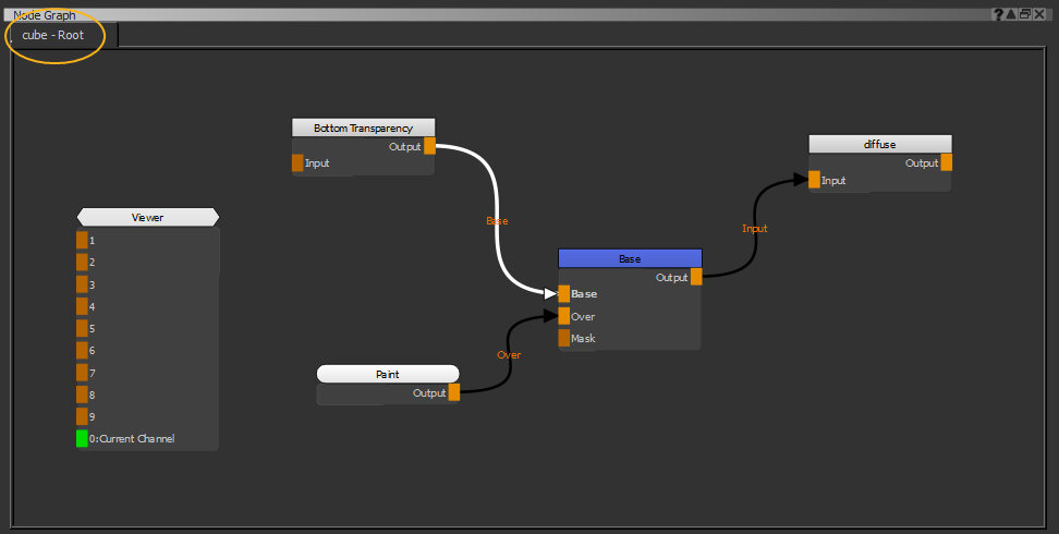 Each Node Graph represents a single object and, just like in the layer system, each channel contains layers, including a Bottom Transparency layer. In the example, a Base layer is also included. If you add more layers to the channel, they appear under the first layer.