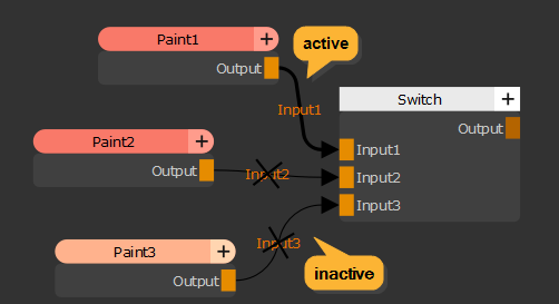 For example, if you select Input 1, Input 1 will be marked as active and Inputs 2 and 3 will be marked as inactive. Active input connection lines are shown in bold. Inactive connections show a cross on the node connection.