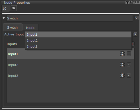 In the Switch node’s Node Properties, the Active Input dropdown menu lists all available inputs and allows you to select the desired input by name.