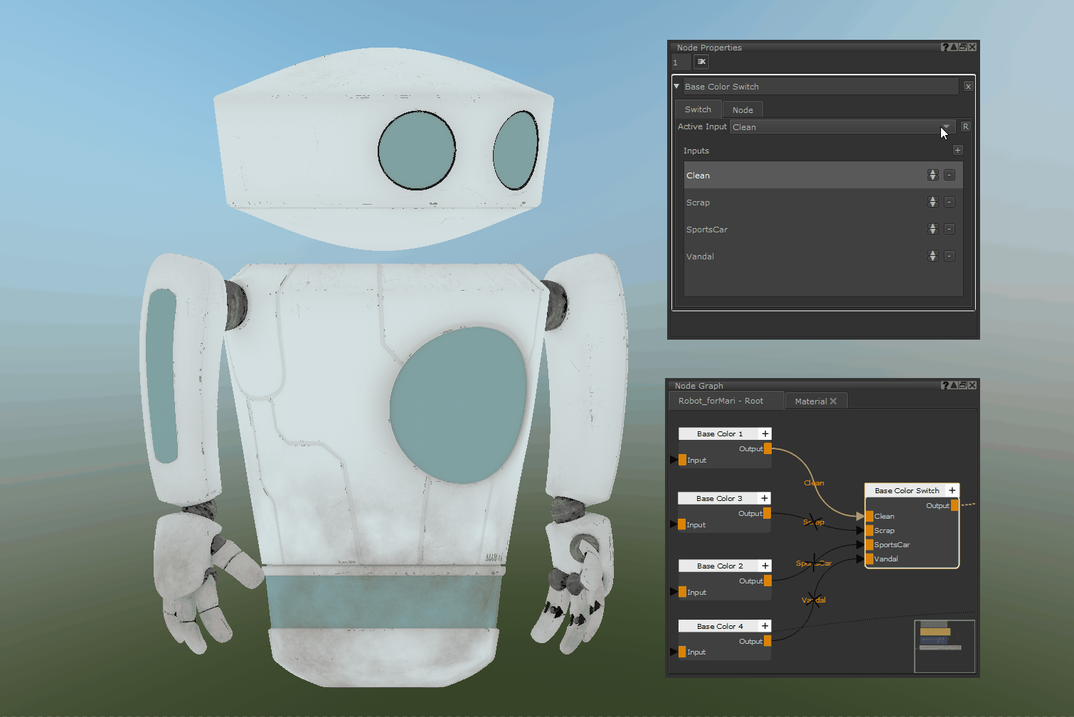 You can use this tool to create variations of materials and quickly switch between them, making your Mari project more versatile and efficient. To more about how to apply this to Materials, see Authoring Material variations using the Switch node.