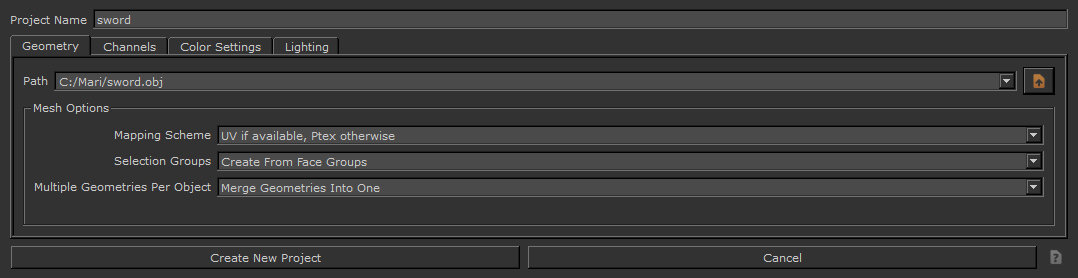 If your .obj consists of multiple geometries, you have the option to Merge Geometries Into One, which is the default behavior, or Create Separate Geometries (Ptex Only). If you select Merge Geometries Into One, Mari combines the individual geometries into a single geometry, while selecting Create Separate Geometries (Ptex Only) creates individual geometries. |