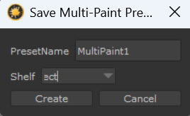 button Saves the current settings as a Preset. Opens up pop up window to define the Preset Name and Shelf to store the preset on.
