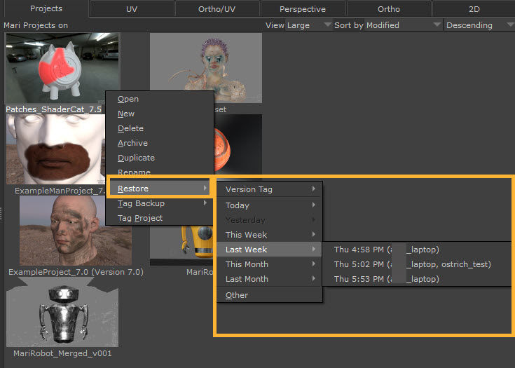 Note: Mari will autosave your project, but these won’t be displayed in the Restore menu. To access autosaves, use the Other option in the context menu, or click the Restore button at the bottom of the Projects tab to open a file browser at the backup location. You can then select an autosave backup. All backups will be listed in this location as *mri files.