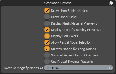 | Hover to Magnify Nodes At | Controls the zoom level of the auto-magnify function to make it easier to work on complex node graphs. When the viewport is scaled at or below 85% (the default value), moving the pointer over the scaled node temporarily enlarges it to 100%. This is useful when dragging connectors from one side of a graph to another. Zoom out and move the pointer over the Source node. When scaled, click the channel hub to initiate the link and then drag to the Target node. When the pointer is over the Target node, it too scales for you to see a full-sized view to connect the channels. (This also works with multiple links if you press the Shift key to select the channels.) |