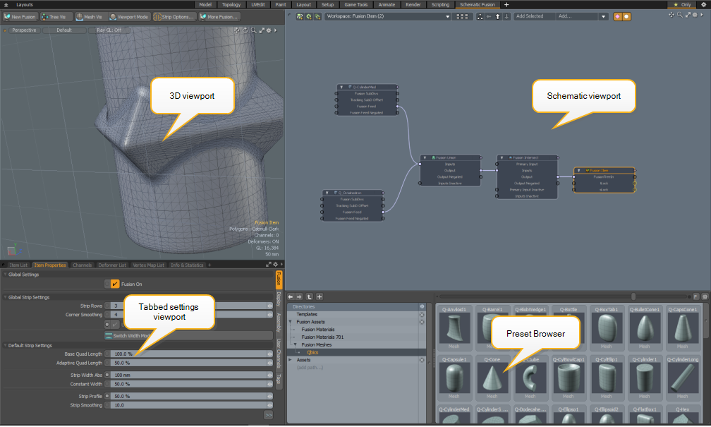 Note:  Schematic Fusion modeling is not compatible with the new MeshFusion workflow introduced in Modo 10.2. You can still edit your model in the Schematic, but you then need to convert it to the new format. For more details on how to do this, see Legacy Fusion Items.