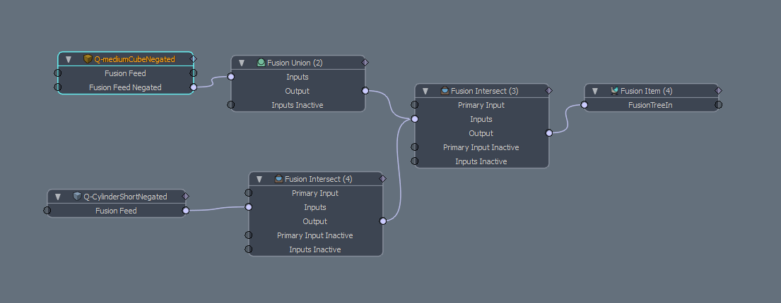 You typically take the Fusion Feed output from a mesh and wire it into the appropriate input of the Boolean operator. Remember to prep the mesh in order to have the Fusion Feed output. The various branches of the node graph are fed into a Fusion Intersect node to combine the branches. The flow then terminates in the Fusion Item.