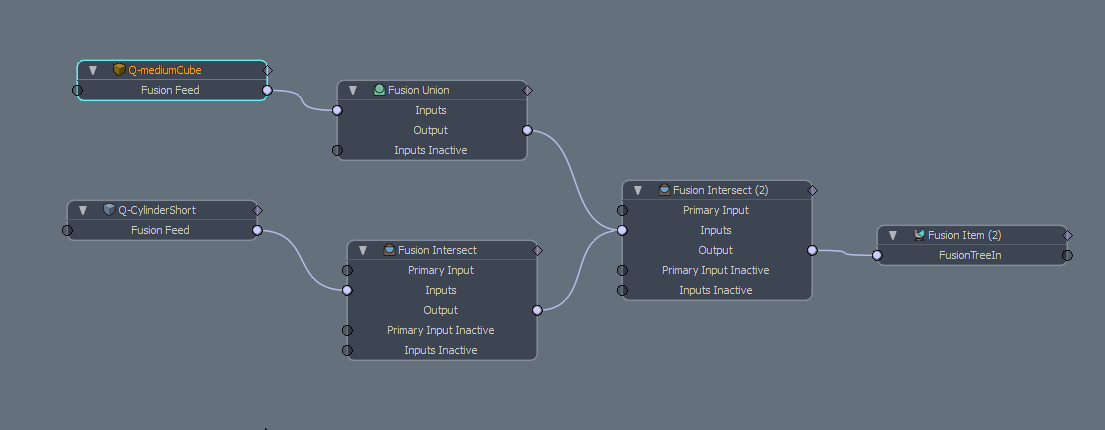 Fusion Operations - Fusion Union, Fusion Intersection, and Fusion Subtract. These take input from Fusion output channels of meshes and/or other Fusion operation nodes. Their output channels may connect to other operation nodes or to the Fusion item.