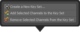 Key sets provide a convenient and quick way for adding keys to multiple channels at once. You can create key sets in advance. For example, you might create a key set for all the animated channels in a character: its arms, hands, and so forth. Alternatively, you can create key sets as you work by adding or removing channels as needed. You select the active key set from the popup menu. To set keys on all the channels in the set, you assign them with the keying button to the right of the Key Set controls.