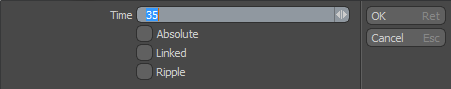 • Time - Determines the position in time to move the selected keys to. • Absolute - When enabled, Absolute time is used, where a specific time can be defined; when disabled, the time is relative to the current time position. • Linked - When enabled Linked keys (such as those of the R, G, and B channels) remain linked in the same relative position, even if only a single channel is edited; when disabled, keys can be moved freely. • Ripple - When enabled, all the following values of those selected are shifted by the same amount. |