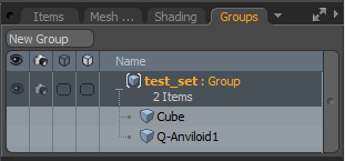 Creates a new group item in the scene and links that to the selection set. Adding an item to the group also tags it with the selection set and adding the selection set to an item also adds it to the group. The selection set name is used for the group created and is displayed under the Groups tab.