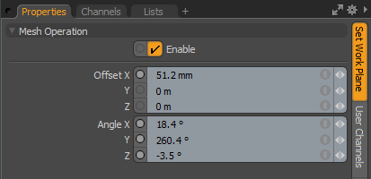 Work Plane bookmarks can be assigned to polygons and re-used later on. Different bookmarks can be saved for each of your scenes. This is useful to store construction planes in the geometry itself. To reset your selected polygons to the origin, select Work Plane > Reset Work Plane.