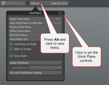 Tip: To pin the Work Plane control options dialog box, hold down the Alt key + click WorkPlane and then click the circle on the top right corner. To reposition the dialog box, click-and-drag it to a new position on the viewport.