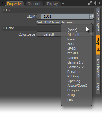Image maps and image sequences that are loaded into the Shader Tree are assigned default color management profiles based on the scene item settings. You can override the settings per image, based on the Colorspace control in the Image Still sub-tab of the Properties panel when the target image map item is selected. The options illustrated here are located in the Nuke-Default color management config.