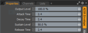 The ADSR Envelope modifier allows you to define the following key profiles: Attack (to rise), Decay (to fall), Sustain (if key is held the key sustains its position), and Release (to idle). The following is an example displayed in the Schematic viewport.
