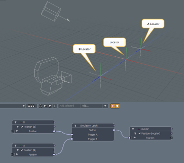 The Simulation Modifier's Output is driving the locator in the middle of the 3D viewport. There are two triggers, the A and B locators.