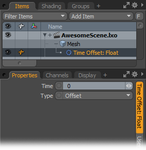 Type: Defines how Modo interprets the Time channel. With the default, Offset, Modo reads a time for the Input channel by adding the Time channel to the current scene time. For example, if the current scene time is 1 second and the Time channel is -2, Modo uses -1 as the time to read the Input channel. Select Constant to have Modo read the Input channel at specific times in the scene. For example, if the Time channel is 2, Modo reads the Input channel at 2 seconds regardless of the current scene time. Use this for animating or rigging the Time Offset modifier.