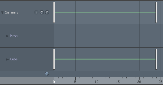 The timeline updates and shows the summary of the overall animation and the cube animation; starting at 0 and ending at 24 seconds.
