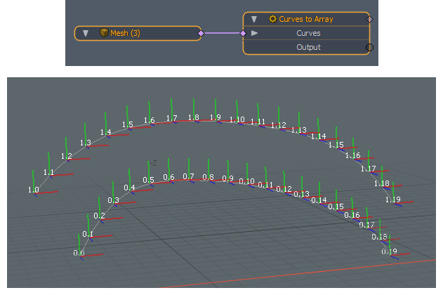 Any item type that provides a Curve Group channel can be connected to the Curves to Array modifier, but the most common connection is a mesh item containing a curve. If multiple curves are connected, the array will contain a sub-array for each curve, with the curve samples stored in the sub-array.