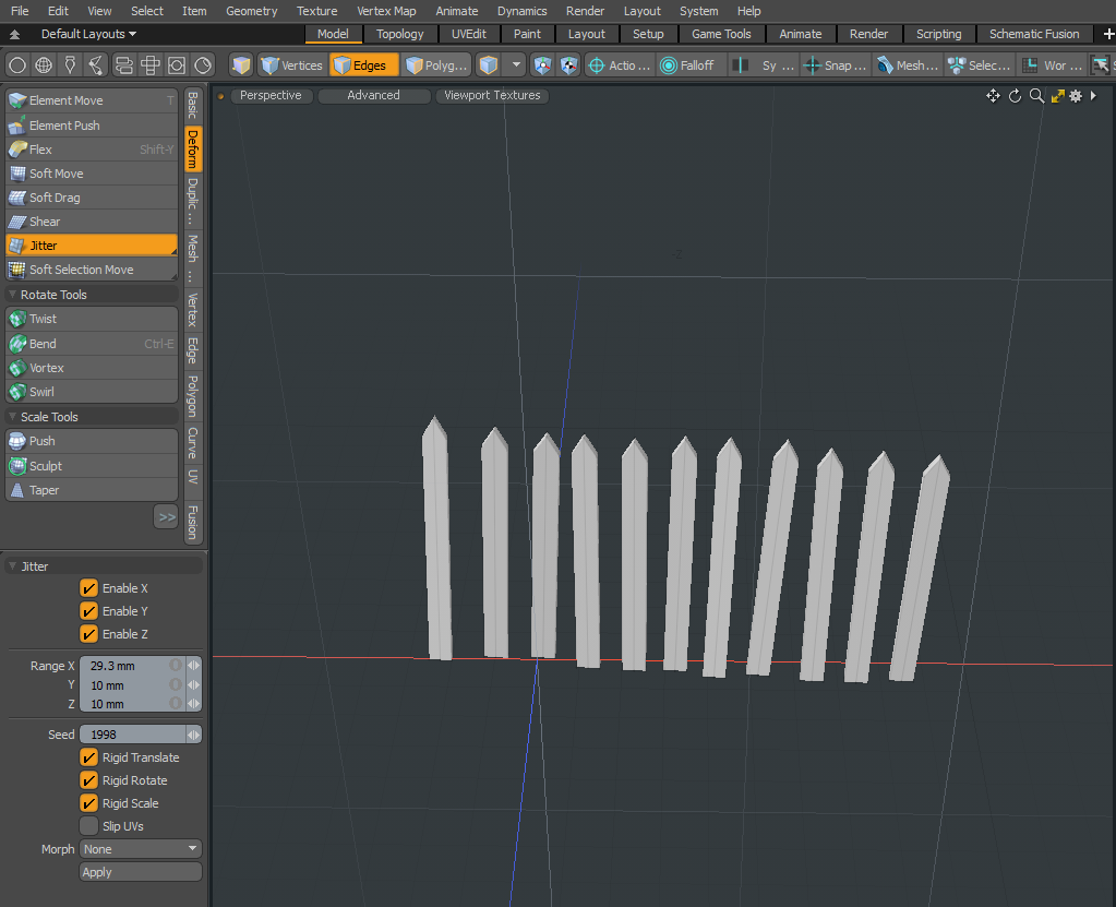 The following is an example of using the Jitter tool to create a fence with random spacing between each post. This is done by duplicating using the Clone tool. By default the Jitter is applied to the vertices. By enabling the Rigid Translate, Rigid Rotate, and Rigid Scale options, all the duplicates are treated as individual objects. Use these options to quickly create real geometry without having to use Replicators.