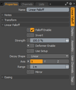 | 13. | In the properties for the Linear Falloff, on the Linear Falloff tab, set Axis to X. |