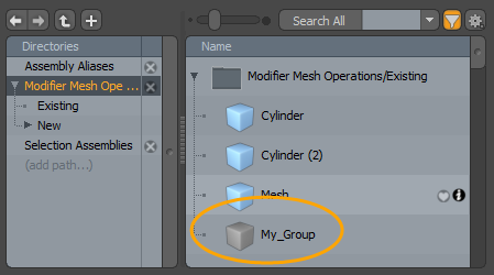 | 8. | In the Add Operator dialog, expand Modifier Mesh Operations > Existing and double-click My_Group. |