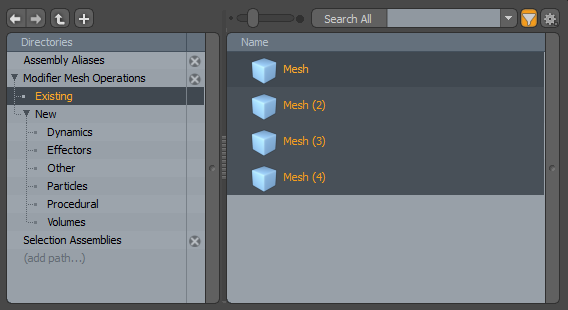 | 8. | In the Add Operator dialog, expand Modifier Mesh Operations > Existing and select all of the mesh items you previously created. |