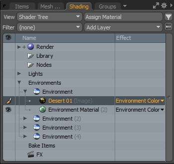 To provide the simplified workflow of the Materials mode, certain layers aren't visible in the tree. Environments can't be edited directly, nor can any shading or render output edits be made. These are done while in the Shader Tree view.