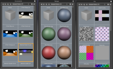 Applies a predefined texture to your scene to quickly see a preview in the 3D Viewport using any of the 3D Viewport Styles. A variety of environments, MatCaps shaders, and UV textures are available. For more information, see Viewport Textures. |