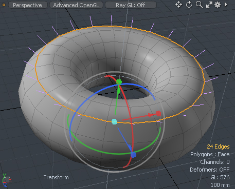 You can select the target vertex normals by using any of the component selection modes: vertices, edges, or polygons. Modo transforms all the vertex normal map values for the associated vertices. Next, select the target Vertex Map to edit in the Lists viewport, and then choose Vertex Map > Transform Normals. You can then use the tool's handles in the 3D viewport to adjust the vertex normal values.