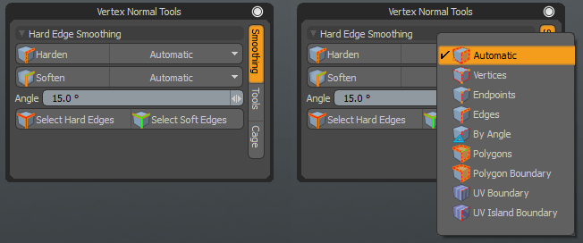 By Angle - If hardening, hardens edges which are sharper than the given angle. If softening, soften edges are shallower than the given angle. This is useful for avoiding smoothing at hard edges, such as right angles.