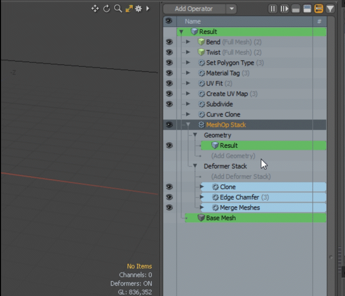Operations and Deformers can be added to stacks within the Mesh operations Viewport by clicking Add Deformer Stack under the expanded Deformer Stack channel, and then selecting an existing operation or deformer from the Add Operation Viewport.